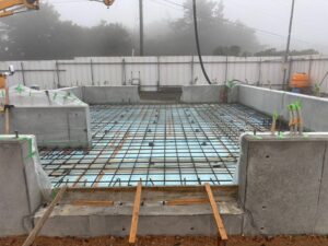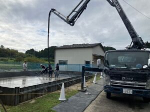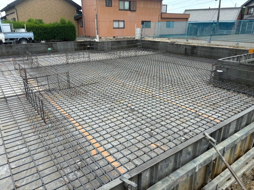 立ち上がりのベースコンクリートを打って、配筋と配管逃げを終えて今からベタ基礎のコンクリートを打設するところです!(最後の写真はまさに今からコンクリートを打設するところで打設用のホースが上から降りてきています)