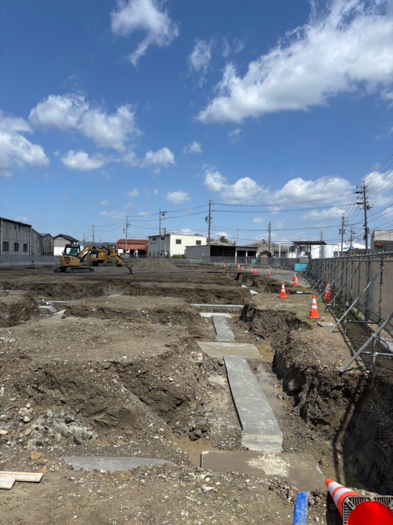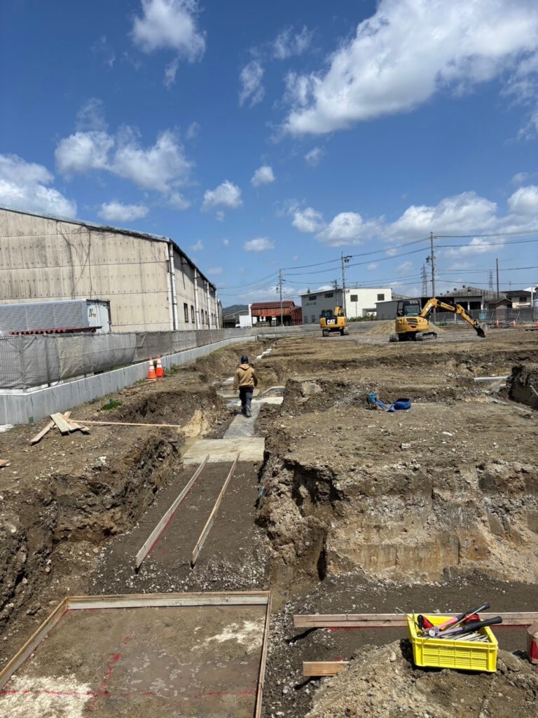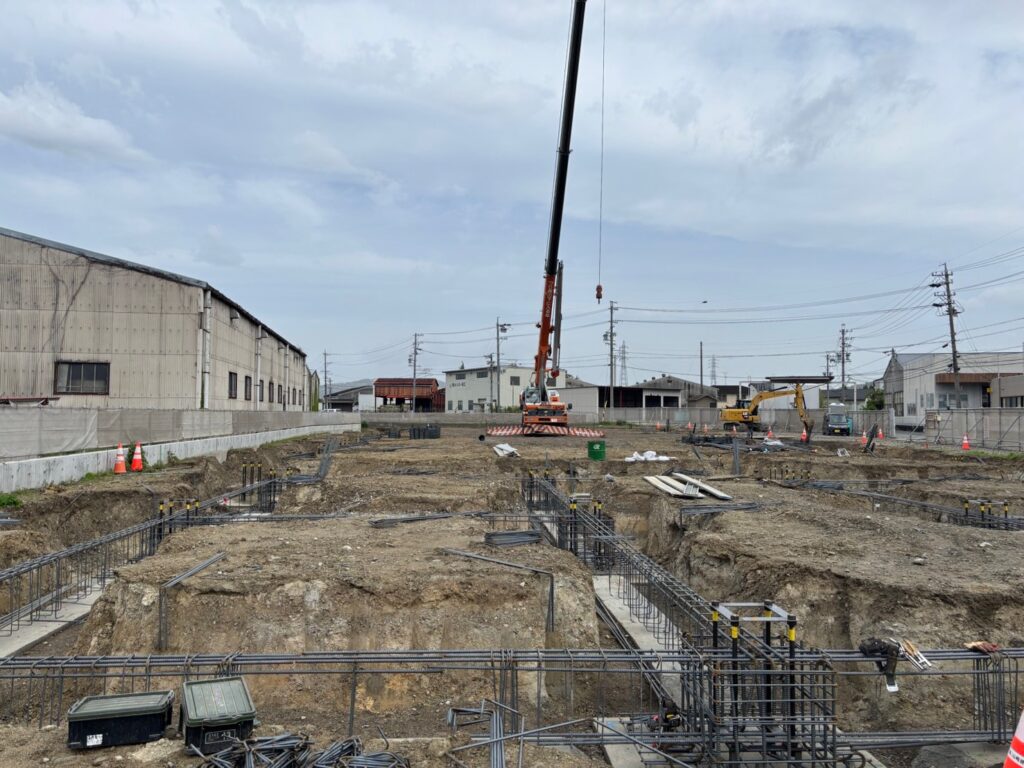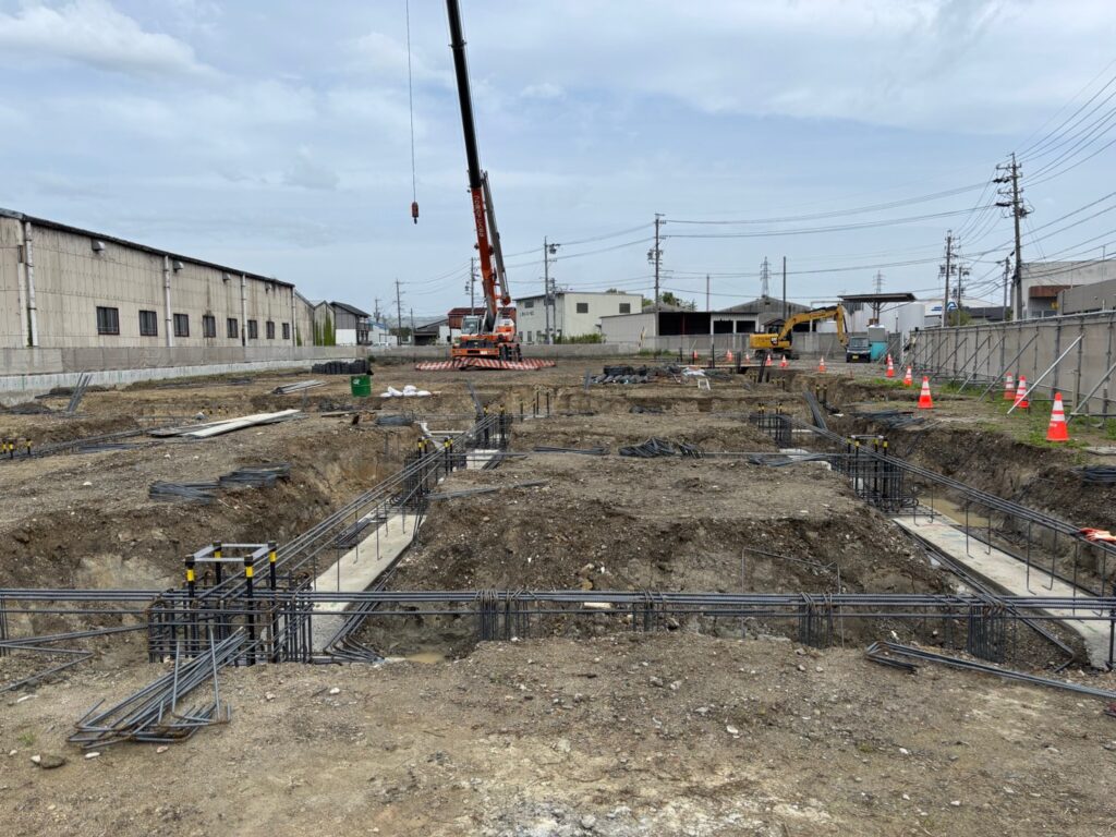 新築工事については基礎のベースコンクリートが終わって、基礎と地中梁の配筋工事中です。